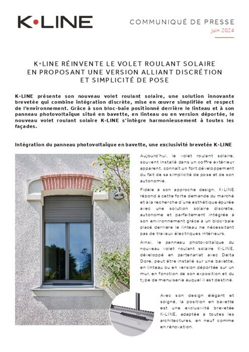 K•LINE présente son nouveau volet roulant solaire, une solution innovante brevetée qui combine intégration discrète, mise en œuvre simplifiée et respect de l’environnement. Grâce à son bloc-baie positionné derrière le linteau et à son panneau photovoltaïque situé en bavette, en linteau ou en version déportée, le nouveau volet roulant solaire K•LINE s’intègre harmonieusement à toutes les façades.
