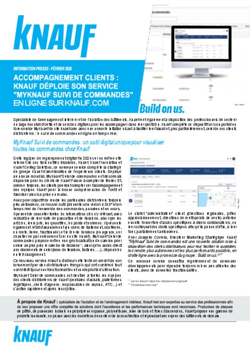 Spécialiste de l’aménagement intérieur et de l’isolation des bâtiments, Knauf met également à disposition des professionnels du secteur un large éventail d’outils et de services digitaux pour les accompagner dans leur quotidien. Knauf complète ce dispositif sur son portail en libre-service MyKnauf du site knauf.com avec une nouvelle initiative visant à faciliter leur travail et, plus particulièrement, celui de ses clients distributeurs : le suivi de commandes en ligne en temps réel.