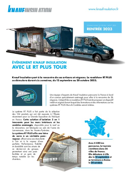 Une équipe d’experts de Knauf Insulation parcourra la France à bord d’un camion spécialement aménagé pour aller à la rencontre de 26 négoces. L’objectif de ce roadshow RT PLUS est de proposer un dispositif inédit et original durant lequel des formations et des informations sur les systèmes RT PLUS Murs & Combles seront initiées.