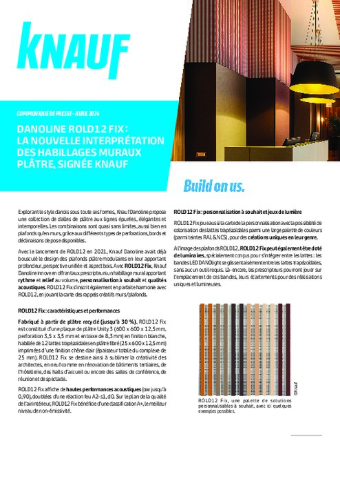 Avec le lancement de ROLD12 en 2021, Knauf Danoline avait déjà bousculé le design des plafonds plâtre modulaires en leur apportant profondeur, perspective unifiée et aspect bois. Avec ROLD12 Fix, Knauf Danoline innove en offrant aux prescripteurs un habillage mural apportant rythme et relief au volume, personnalisation à souhait et qualités acoustiques. ROLD12 Fix s’inscrit également en parfaite harmonie avec ROLD12, en jouant la carte des rappels créatifs murs/plafonds.