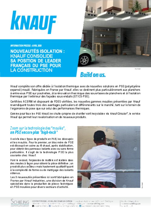 Knauf complète son offre dédiée à l’isolation thermique avec de nouvelles solutions en PSE (polystyrène expansé) moulé. Fabriquées en France par Knauf, elles se destinent plus particulièrement aux planchers à entrevous PSE sur poutrelles, à la rénovation thermique des sous-faces de planchers et à l’isolation thermique par l’extérieur des façades sous enduits (ETICS-PSE).