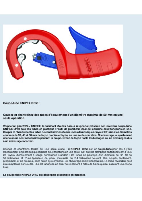 KNIPEX, le fabricant d'outils basé à Wuppertal présente son nouveau coupe-tube KNIPEX DP50 pour les tubes en plastique : l'outil de plomberie idéal qui combine deux fonctions en une. Coupez et chanfreinez les tubes de canalisations d'eaux usées domestiques (tuyaux HT) dans les diamètres courants de 32, 40 et 50 mm de façon précise et facile, en une seule opération. Ni ébavurage, ni ajustement ultérieurs ne sont nécessaires pendant la coupe.