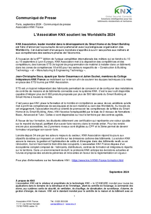 À l’occasion de la 47e édition de l’unique compétition internationale des métiers qui se tiendra du 10 au 15 septembre à Lyon Eurexpo, KNX Association met à la disposition des compétitrices et des compétiteurs, des licences ETS (le logiciel de programmation de matériel à installer dans un bâtiment) dans les zones de compétences 18 et 60 pour les secteurs respectifs de « Construction & Building Technology » et « Manufacturing & Engineering Technology ».