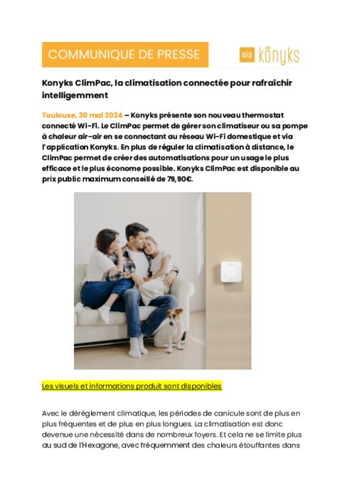 Konyks présente son nouveau thermostat connecté Wi-Fi. Le ClimPac permet de gérer son climatiseur ou sa pompe à chaleur air-air en se connectant au réseau Wi-Fi domestique et via l’application Konyks. En plus de réguler la climatisation à distance, le ClimPac permet de créer des automatisations pour un usage le plus efficace et le plus économe possible. Konyks ClimPac est disponible au prix public maximum conseillé de 79,90€.