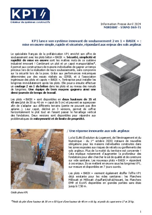Le spécialiste français de la préfabrication KP1 enrichit son offre de soubassement avec les plots béton « Basik ». Sécurité, simplicité et rapidité de mise en œuvre sont les maîtres mots de ce système industriel innovant.