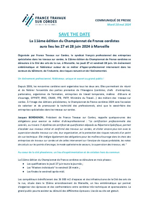 Organisée par France Travaux sur Cordes, le syndicat français professionnel des entreprises spécialisées dans les travaux sur cordes, la 11e édition du Championnat de France cordistes se déroulera à la Cité des arts de la rue, à Marseille, les jeudi 27 et vendredi 28 juin. Un événement emblématique et fédérateur autour de ce métier d’hyper-professionnel intervenant dans les secteurs du bâtiment, de l’industrie, des risques naturels et de l’événementiel.