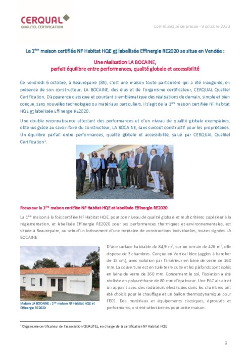 Ce vendredi 6 octobre, à Beaurepaire (85), c’est une maison toute particulière qui a été inaugurée, en présence de son constructeur, La Bocaine, des élus et de l’organisme certificateur, Cerqual Qualitel Certification. D’apparence classique et pourtant si emblématique des réalisations de demain, simple et bien conçue, sans nouvelles technologies ou matériaux particuliers, il s’agit de la 1re maison certifiée NF Habitat HQE et labellisée Effinergie RE2020.