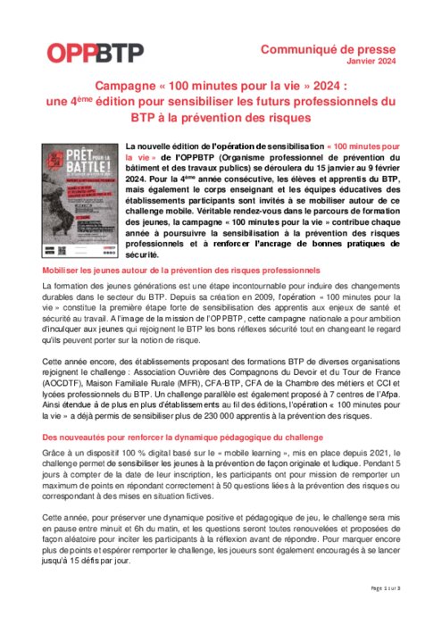 La nouvelle édition de l’opération de sensibilisation « 100 minutes pour la vie » de l’OPPBTP (Organisme professionnel de prévention du bâtiment et des travaux publics) se déroulera du 15 janvier au 9 février 2024. Pour la 4ème année consécutive, les élèves et apprentis du BTP, mais également le corps enseignant et les équipes éducatives des établissements participants sont invités à se mobiliser autour de ce challenge mobile
