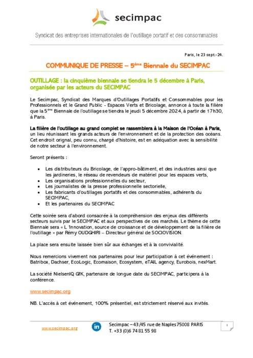 Le Secimpac (syndicat des marques d’outillages portatifs et consommables pour les professionnels et le grand public - espaces verts et bricolage) annonce à toute la filière que la 5e Biennale de l’outillage se tiendra le jeudi 5 décembre 2024, à partir de 17h30, à Paris. La filière de l’outillage au grand complet se rassemblera à la Maison de l’océan à Paris, un lieu réunissant les grands acteurs de l'environnement et de la protection des océans.