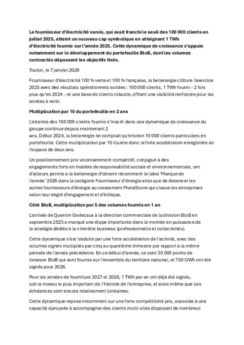 Le fournisseur d’électricité varois, qui avait franchi le seuil des 100 000 clients en juillet 2025, atteint un nouveau cap symbolique en atteignant 1 TWh d’électricité fournie sur l’année 2025. Cette dynamique de croissance s’appuie notamment sur le développement du portefeuille BtoB, dont les volumes contractés dépassent les objectifs fixés.