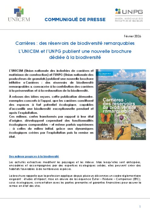 L’UNICEM (Union nationale des industries de carrières et matériaux de construction) et l’UNPG (Union nationale des producteurs de granulats) publient une nouvelle brochure intitulée « Carrières : des réservoirs de biodiversité remarquables », consacrée à la contribution des carrières à la préservation et à la restauration de la biodiversité. À rebours des idées reçues, cette publication démontre, exemples concrets à l’appui, que les carrières constituent des espaces à fort potentiel écologique, capables d’accueillir une biodiversité exceptionnelle pendant et après l’exploitation. Ces milieux, certes transformés par rapport à leur état d’origine, développent cependant des fonctionnalités écologiques comparables – et même parfois supérieures - à celles du milieu initial, grâce aux dynamiques écologiques créées par l’exploitation puis la remise en état.
