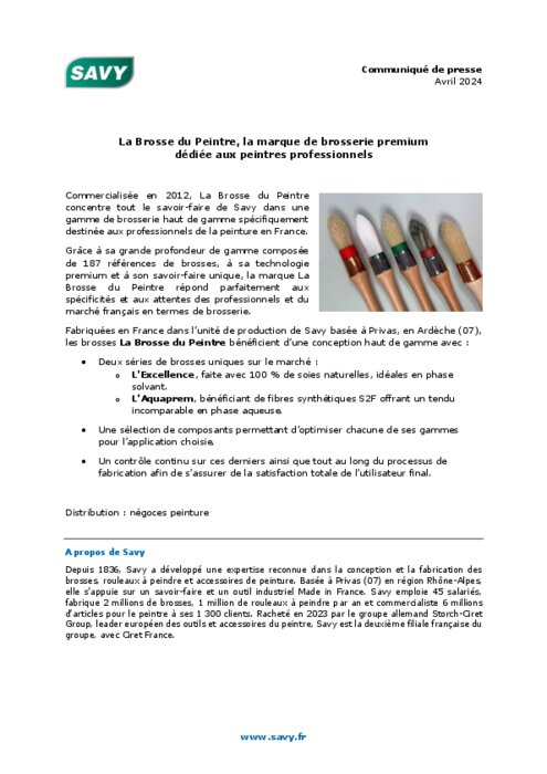 Industriels 09 avril 2024 - 10:56 Commercialisée en 2012, La Brosse du Peintre concentre tout le savoir-faire de Savy dans une gamme de brosserie haut de gamme spécifiquement destinée aux professionnels de la peinture en France. PDF (134 Ko) Télécharger