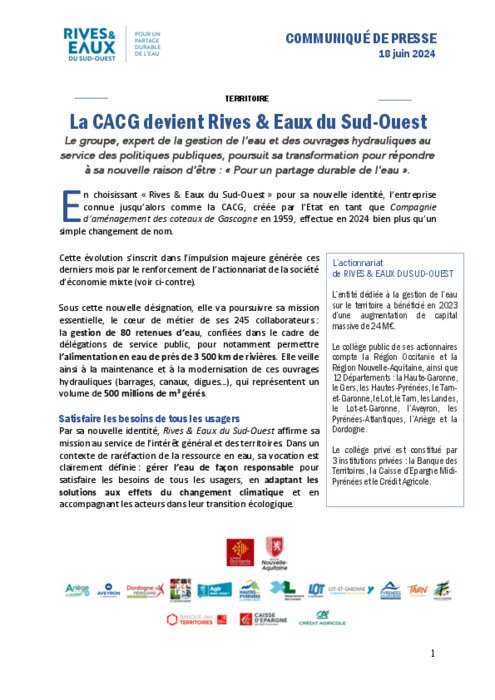 Institutionnels 19 juin 2024 - 16:12 Le groupe, expert de la gestion de l’eau et des ouvrages hydrauliques au service des politiques publiques, poursuit sa transformation pour répondre à sa nouvelle raison d’être : « Pour un partage durable de l’eau ». PDF (3 Mo) Télécharger