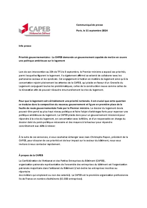 Lors de son intervention au 20h de TF1 le 8 septembre, le Premier ministre a exposé ses priorités, parmi lesquelles figurent le logement. Il a également affirmé sa volonté de collaborer avec les partenaires sociaux et les syndicats. Cet engagement à l’action en matière de logement ainsi qu’à la concertation rejoint pleinement les attentes de la CAPEB, qui plaide en faveur d’un Grenelle du Logement conjuguant toutes les problématiques, celles de la construction neuve comme celles de la rénovation afin de pouvoir résoudre structurellement la crise du logement.