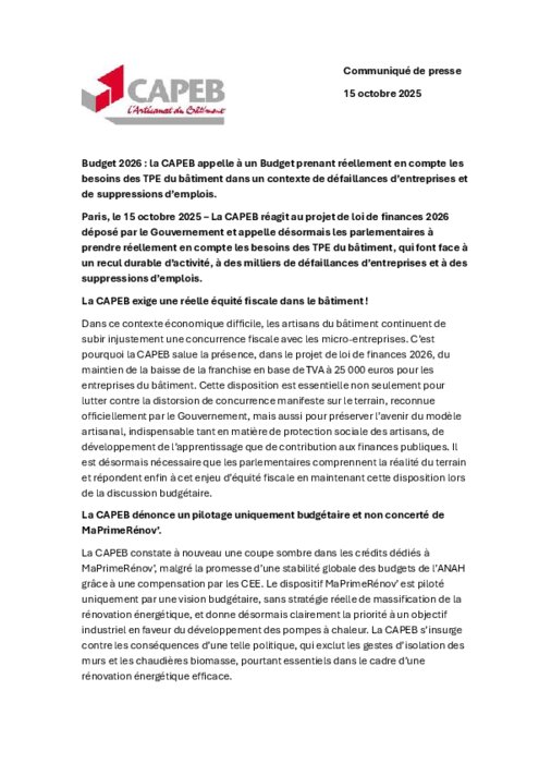 La Capeb réagit au projet de loi de finances 2026 déposé par le gouvernement et appelle désormais les parlementaires à prendre réellement en compte les besoins des TPE du bâtiment, qui font face à un recul durable d’activité, à des milliers de défaillances d’entreprises et à des suppressions d’emplois.