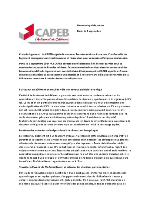 La CAPEB adresse ses félicitations à M. Michel Barnier pour sa nomination au poste de Premier ministre. Cette nomination intervient dans un contexte où les besoins et les défis du logement sont considérables. C’est pourquoi la CAPEB appelle le Premier ministre à considérer ce sujet comme une priorité et à le traiter sans délai avec l’ensemble de la filière et en recourant à tous les leviers à sa disposition.