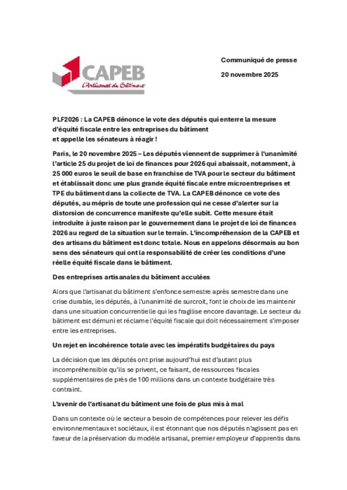 Les députés viennent de supprimer à l’unanimité l’article 25 du projet de loi de finances pour 2026 qui abaissait, notamment, à 25 000 euros le seuil de base en franchise de TVA pour le secteur du bâtiment et établissait donc une plus grande équité fiscale entre microentreprises et TPE du bâtiment dans la collecte de TVA. La CAPEB dénonce ce vote des députés, au mépris de toute une profession qui ne cesse d’alerter sur la distorsion de concurrence manifeste qu’elle subit. Cette mesure était introduite à juste raison par le gouvernement dans le projet de loi de finances 2026 au regard de la situation sur le terrain. L’incompréhension de la CAPEB et des artisans du bâtiment est donc totale.