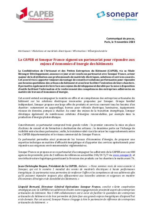 La Capeb - via sa filiale Béranger Développement - annonce avoir conclu un partenariat avec Sonepar France, acteur majeur de la distribution aux professionnels de matériels électriques, solutions et services associés. Cet accord vise à apporter toujours davantage de conseils et solutions performantes pour répondre aux besoins quotidiens des artisans du bâtiment et ainsi leur faciliter l’exécution de leurs chantiers.