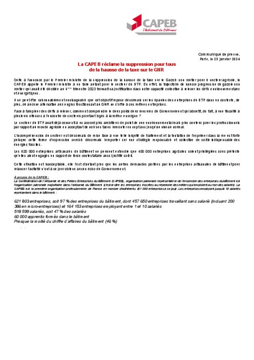 La CAPEB réclame la suppression de la hausse de la taxe sur le GNR