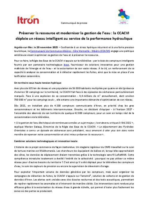 Confrontée à un stress hydrique récurrent et à une forte pression touristique, la Communauté de communes Albères - Côte Vermeille - Illibéris (CCACVI) engage une politique ambitieuse visant à optimiser sa gestion de l’eau et à préserver la ressource. Pour ce faire, la Régie des Eaux de la CCACVI s’appuie sur la télérelève - par le biais de compteurs intelligents fournis par son partenaire technologique Itron, fournisseur de solutions innovantes pour une gestion maîtrisée de l'énergie et de l'eau - et la sectorisation de son vaste réseau. À la clé, un renforcement de sa capacité à analyser sa consommation et à détecter rapidement les fuites, ainsi que la mise en place d’une tarification saisonnière.