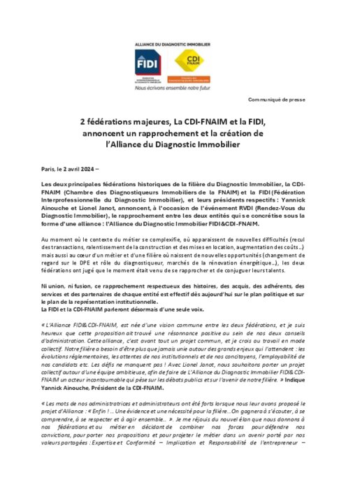 Les deux principales fédérations historiques de la filière du Diagnostic Immobilier, la CDI-FNAIM (Chambre des Diagnostiqueurs Immobiliers de la FNAIM) et la FIDI (Fédération Interprofessionnelle du Diagnostic Immobilier), et leurs présidents respectifs : Yannick Ainouche et Lionel Janot, annoncent, à l’occasion de l’événement RVDI (Rendez-Vous du Diagnostic Immobilier), le rapprochement entre les deux entités qui se concrétise sous la forme d’une alliance : l’Alliance du Diagnostic Immobilier FIDI&CDI-FNAIM.
