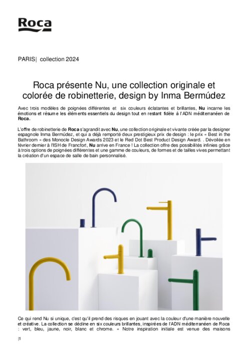 L’offre de robinetterie de Roca s'agrandit avec Nu, une collection originale et vivante créée par la designer espagnole Inma Bermúdez, et qui a déjà remporté deux prestigieux prix de design : le prix « Best in the Bathroom » des Monocle Design Awards 2023 et le Red Dot Best Product Design Award. Dévoilée en février dernier à l'ISH de Francfort, Nu arrive en France.