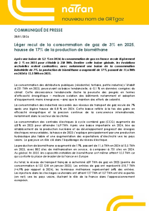 Après une baisse de -5,2 % en 2024, la consommation de gaz en France recule légèrement de -3 % en 2025 pour s’établir à 350 TWh. Derrière cette baisse globale, les évolutions sectorielles restent contrastées, avec notamment une baisse de la consommation industrielle de -7 %. La production de biométhane a augmenté de +17 %, passant de 11,6 en 2024 à 13,5 TWh en 2025.