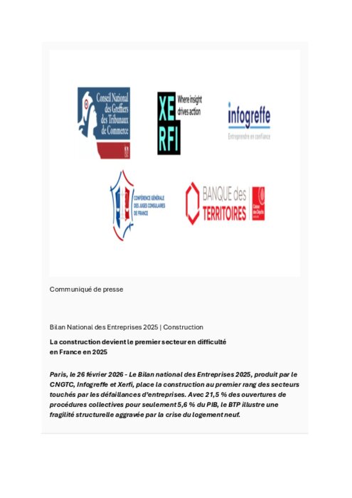 Le Bilan national des Entreprises 2025, produit par le CNGTC, Infogreffe et Xerfi, place la construction au premier rang des secteurs touchés par les défaillances d’entreprises. Avec 21,5 % des ouvertures de procédures collectives pour seulement 5,6 % du PIB, le BTP illustre une fragilité structurelle aggravée par la crise du logement neuf.