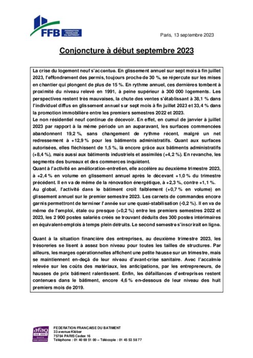 En glissement annuel sur sept mois à fin juillet 2023, l’effondrement des permis, toujours proche de 30 %, se répercute sur les mises en chantier qui plongent de plus de 15 %. En rythme annuel, ces dernières tombent à proximité du niveau relevé en 1991, à peine supérieur à 300 000 logements.