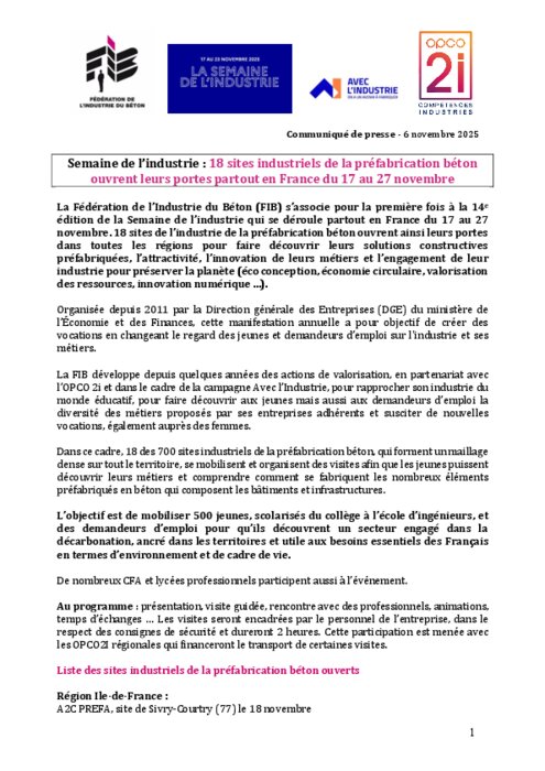 La Fédération de l’Industrie du Béton (FIB) s’associe pour la première fois à la 14e édition de la Semaine de l’industrie qui se déroule partout en France du 17 au 27 novembre. 18 sites de l’industrie de la préfabrication béton ouvrent ainsi leurs portes dans toutes les régions pour faire découvrir leurs solutions constructives préfabriquées, l’attractivité, l’innovation de leurs métiers et l’engagement de leur industrie pour préserver la planète (éco conception, économie circulaire, valorisation des ressources, innovation numérique ...).