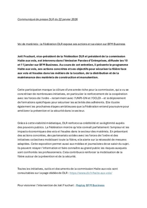 Joël Fruchart, vice‑président de la Fédération DLR et président de la commission Halte aux vols, est intervenu dans l’émission Paroles d’Entreprises, diffusée les 10 et 11 janvier sur BFM Business. Au cours de cet entretien, il présente le programme Halte aux vols, ses actions concrètes et ses objectifs pour sécuriser la filière face aux vols et fraudes dans les métiers de la location, de la distribution et de la maintenance des matériels de construction et manutention.