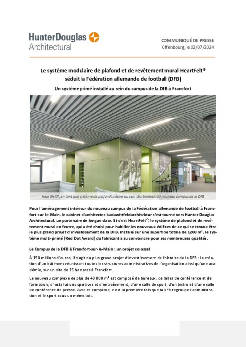Pour l’aménagement intérieur du nouveau campus de la Fédération allemande de football à Francfort-sur-le-Main, le cabinet d'architectes kadawittfeldarchitektur s'est tourné vers Hunter Douglas Architectural, un partenaire de longue date. Et c’est HeartFelt, le système de plafond et de revêtement mural en feutre, qui a été choisi pour habiller les nouveaux édifices de ce qui se trouve être le plus grand projet d’investissement de la DFB.
