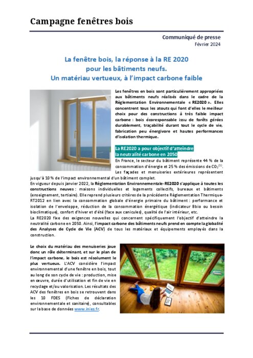Les fenêtres en bois sont particulièrement appropriées aux bâtiments neufs réalisés dans le cadre de la Règlementation Environnementale « RE2020 ». Elles concentrent tous les atouts qui font d’elles le meilleur choix pour des constructions à très faible impact carbone : bois écoresponsable issu de forêts gérées durablement, traçabilité durant tout le cycle de vie, fabrication peu énergivore et hautes performances d’isolation thermique.