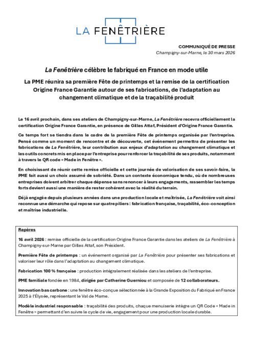 Pensé comme un temps de découverte et de valorisation du savoir-faire industriel de la PME, ce rendez-vous permettra de mettre en lumière plusieurs fabrications et solutions concrètes en lien avec l’adaptation au changement climatique : fenêtres bas carbone, QR code de traçabilité, nouveaux châssis, vitrage 4 saisons et volets solaires.