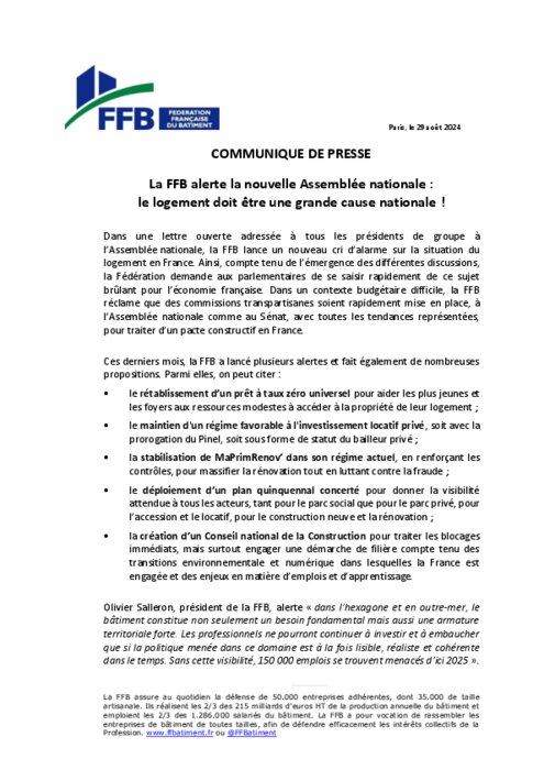 Dans une lettre ouverte adressée à tous les présidents de groupe à l’Assemblée nationale, la FFB lance un nouveau cri d’alarme sur la situation du logement en France. Ainsi, compte tenu de l’émergence des différentes discussions, la Fédération demande aux parlementaires de se saisir rapidement de ce sujet brûlant pour l’économie française. Dans un contexte budgétaire difficile, la FFB réclame que des commissions transpartisanes soient rapidement mises en place, à l’Assemblée nationale comme au Sénat, avec toutes les tendances représentées, pour traiter d’un pacte constructif en France.