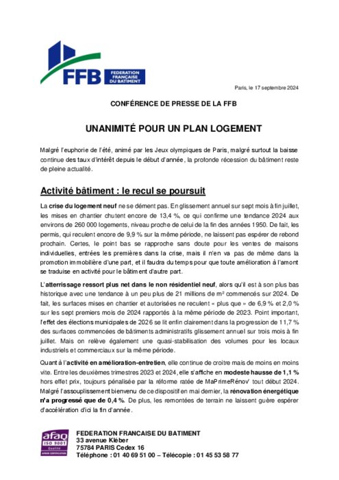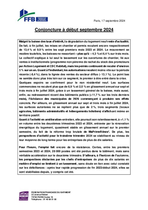 Malgré la baisse des taux d’intérêt, la dégradation du logement neuf reste d’actualité. De fait, à fin juillet, les mises en chantier et permis reculent encore respectivement de 13,4 % et 9,9 % entre les sept premiers mois 2023 et 2024. Le mouvement se modère toutefois, les baisses ne ressortant « plus qu’à » 4,3 % et 6,4 % sur trois mois. Le collectif explique à lui seul le tassement sur les ouvertures de chantier, lié aux ventes à institutionnels (programme non pérenne de rachat du stock des promoteurs par Action Logement et CDC Habitat), mais les permis continuent de reculer d’environ 5 % sur un an. Quant à l’individuel, les autorisations reculent moins vite sur la période récente (-8,4 %), dans la lignée des ventes du secteur diffus (- 13,1 %).