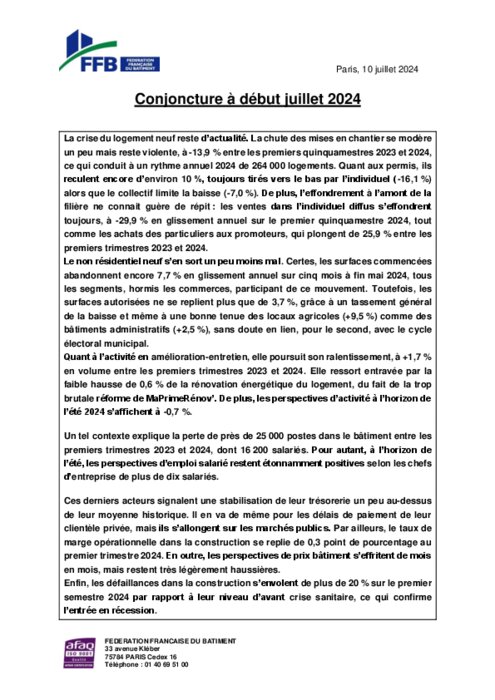 La phase des législatives n’a en rien modifié la situation du secteur : il entre clairement dans la crise et risque de souffrir plus durement encore de toute forme d’attentisme. Il importe que des décisions soient prises urgemment pour éviter l’effondrement. A cet effet, la FFB adresse dix solutions.