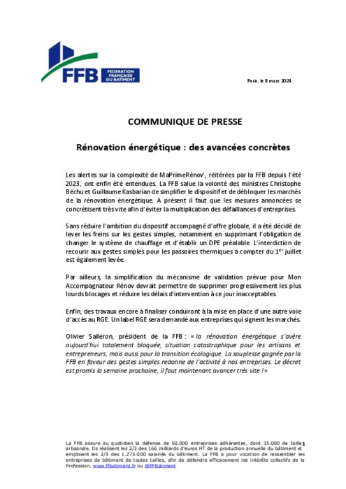 Les alertes sur la complexité de MaPrimeRénov’, réitérées par la FFB depuis l’été 2023, ont enfin été entendues. La FFB salue la volonté des ministres Christophe Béchu et Guillaume Kasbarian de simplifier le dispositif et de débloquer les