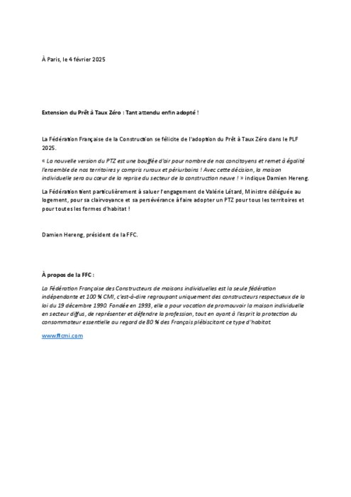 La Fédération Française de la Construction se félicite de l'adoption du Prêt à Taux Zéro dans le PLF 2025. « La nouvelle version du PTZ est une bouffée d’air pour nombre de nos concitoyens et remet à égalité l’ensemble de nos territoires y compris ruraux et périurbains ! Avec cette décision, la maison individuelle sera au cœur de la reprise du secteur de la construction neuve ! » indique Damien Hereng.