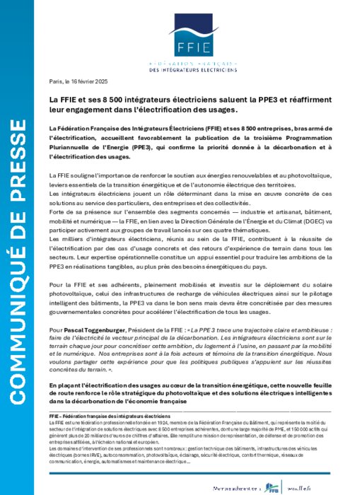 La Fédération Française des Intégrateurs Électriciens (FFIE) et ses 8 500 entreprises, bras armé de l’électrification, accueillent favorablement la publication de la troisième Programmation Pluriannuelle de l’Energie (PPE3), qui confirme la priorité donnée à la décarbonation et à l’électrification des usages.