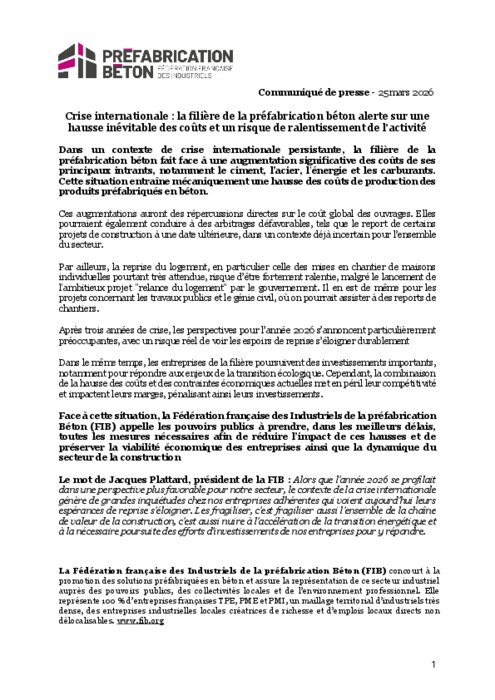 Dans un contexte de crise internationale persistante, la filière de la préfabrication béton fait face à une augmentation significative des coûts de ses principaux intrants, notamment le ciment, l’acier, l'énergie et les carburants. Cette situation entraîne mécaniquement une hausse des coûts de production des produits préfabriqués en béton.