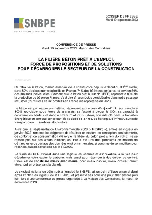Institutionnels 19 septembre 2023 - 11:16 Le syndicat national du béton prêt à l’emploi, le SNBPE, fait un point d’étape un an et demi après l’entrée en vigueur de la RE2020, et présente ses solutions pour aller encore plus loin. PDF (422 Ko) Télécharger PDF (1 Mo) Télécharger