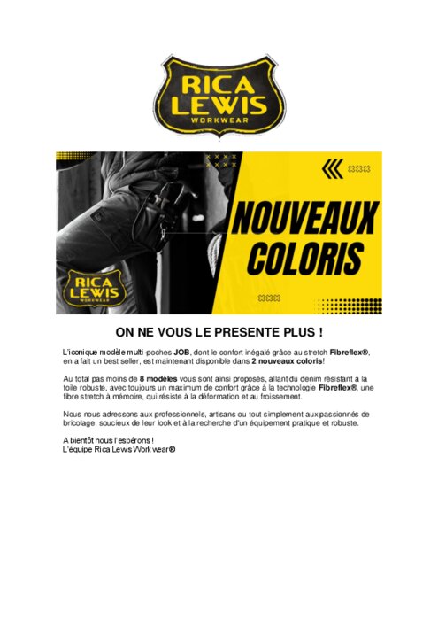L’iconique modèle multi-poches JOB, dont le confort inégalé grâce au stretch Fibreflex, en a fait un best seller, est maintenant disponible dans 2 nouveaux coloris. Au total pas moins de 8 modèles vous sont ainsi proposés, allant du denim résistant à la toile robuste, avec toujours un maximum de confort grâce à la technologie Fibreflex, une fibre stretch à mémoire, qui résiste à la déformation et au froissement.