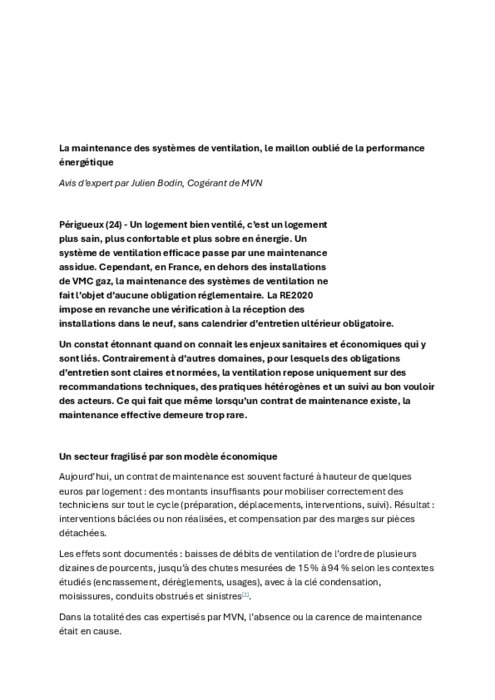 Un logement bien ventilé, c’est un logement plus sain, plus confortable et plus sobre en énergie. Un système de ventilation efficace passe par une maintenance assidue. Cependant, en France, en dehors des installations de VMC gaz, la maintenance des systèmes de ventilation ne fait l’objet d’aucune obligation réglementaire. La RE2020 impose en revanche une vérification à la réception des installations dans le neuf, sans calendrier d’entretien ultérieur obligatoire.
