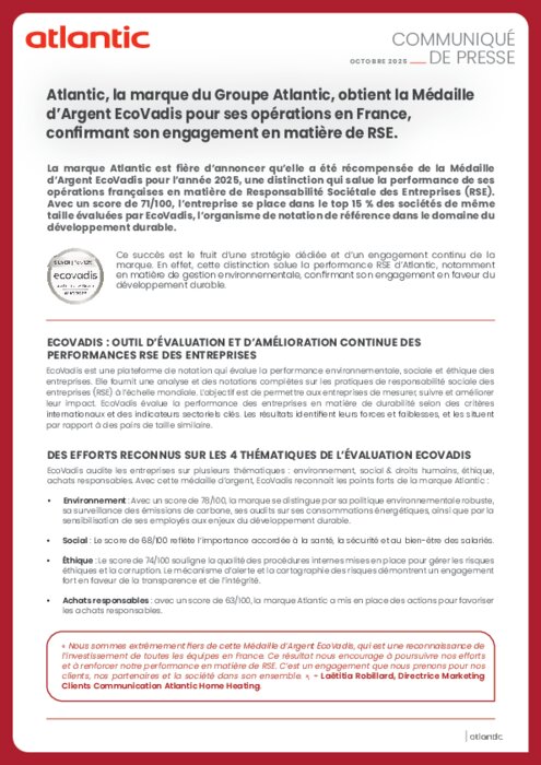 La marque Atlantic est fière d’annoncer qu’elle a été récompensée de la Médaille d’Argent EcoVadis pour l’année 2025, une distinction qui salue la performance de ses opérations françaises en matière de Responsabilité Sociétale des Entreprises (RSE). Avec un score de 71/100, l’entreprise se place dans le top 15 % des sociétés de même taille évaluées par EcoVadis, l’organisme de notation de référence dans le domaine du développement durable.