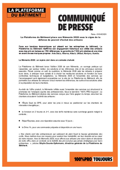 Face aux tensions économiques qui pèsent sur les entreprises du bâtiment, La Plateforme du Bâtiment réaffirme son engagement historique aux côtés des artisans avec des prix en baisse sur 700 références, la garantie de 7 000 prix stables et une mise en avant de ses marques propres : Arte Déco, Alterna, Altech, Ultibat, Novipro, Aurelia.