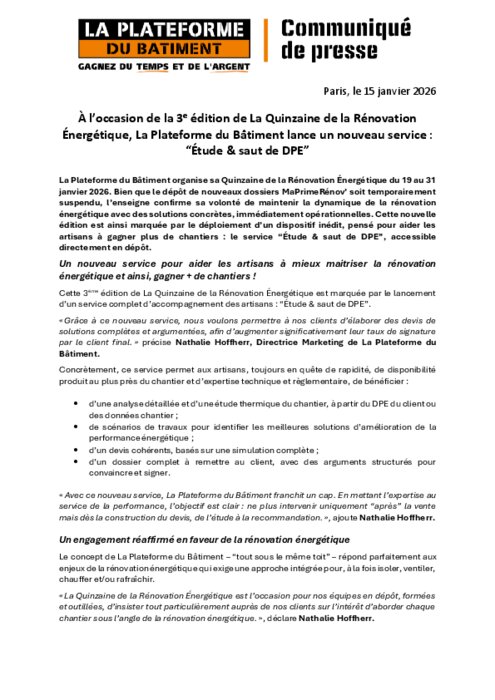 La Plateforme du Bâtiment organise sa Quinzaine de la Rénovation Énergétique du 19 au 31 janvier 2026. Bien que le dépôt de nouveaux dossiers MaPrimeRénov’ soit temporairement suspendu, l’enseigne confirme sa volonté de maintenir la dynamique de la rénovation énergétique avec des solutions concrètes, immédiatement opérationnelles. Cette nouvelle édition est ainsi marquée par le déploiement d’un dispositif inédit, pensé pour aider les artisans à gagner plus de chantiers : le service “Étude & saut de DPE”, accessible directement en dépôt.