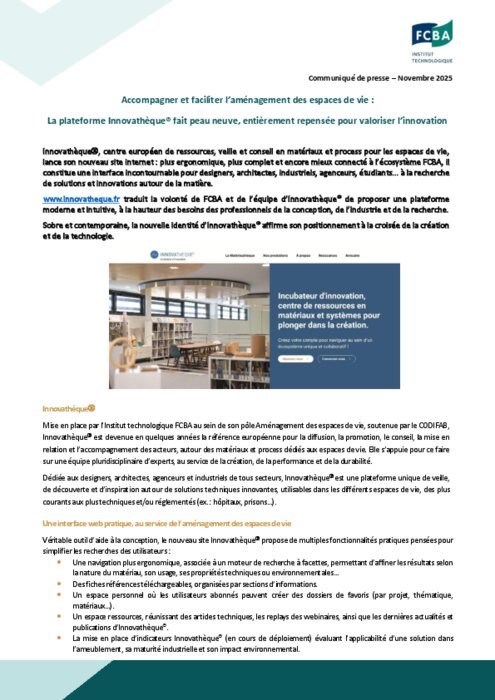 Innovathèque, centre européen de ressources, veille et conseil en matériaux et process pour les espaces de vie, lance son nouveau site internet : plus ergonomique, plus complet et encore mieux connecté à l’écosystème FCBA, il constitue une interface incontournable pour designers, architectes, industriels, agenceurs, étudiants... à la recherche de solutions et innovations autour de la matière.