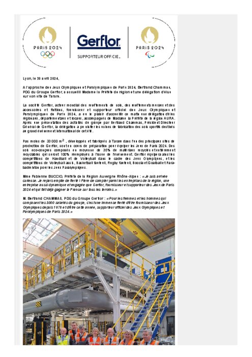 Industriels 30 avril 2024 - 17:29 À l’approche des Jeux Olympiques et Paralympiques de Paris 2024, Bertrand Chammas, p-dg du groupe Gerflor, a accueilli madame la Préfète de région et une délégation d’élus sur son site de Tarare. PDF (602 Ko) Télécharger