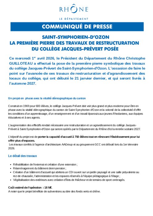 Institutionnels 03 avril 2026 - 08:58 Ce mercredi 1er avril 2026, le Président du Département du Rhône Christophe GUILLOTEAU a effectué la pose de la première pierre symbolique des travaux du collège Jacques-Prévert de Saint-Symphorien-d’Ozon. PDF (64 Ko) Télécharger SSO TRAVAUX